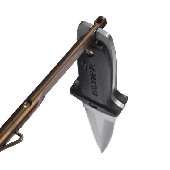 Manejable y compacto cuchillo de pesca submarina. Cuchilla doble filo, liso y sierra (Shark Tooth), estudiado para ser fijado en el cinturón o el brazo. Fabricado con el mejor acero es un verdadero instrumento dedicado al pescasub. Corte en el mango para extraer varillas enrocadas y perforación para enderezarlas. Incorpora un practico sistema para que el cuchillo quede en la mano incluso sin aguantarlo.